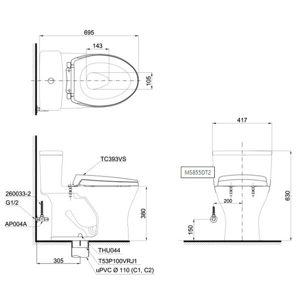 Bàn cầu 1 khối TOTO MS855DT2XW gồm: