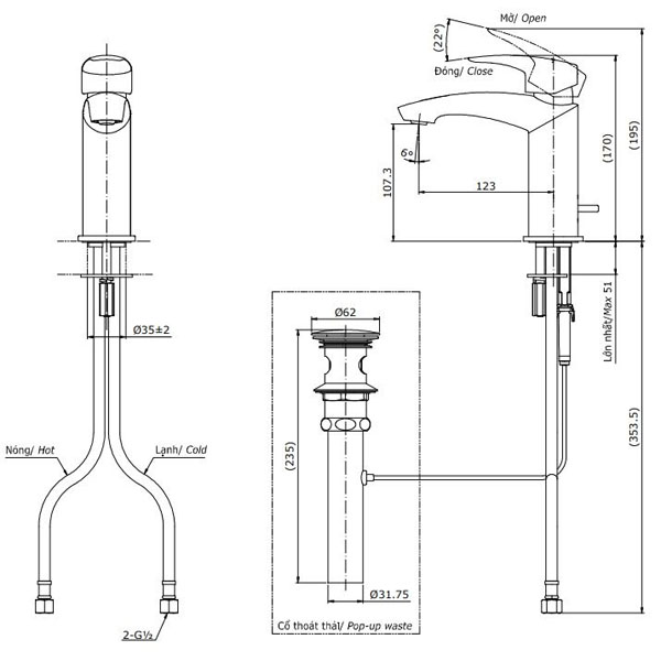Áp lực nước: 0.05MPa ~ 0.75MPa